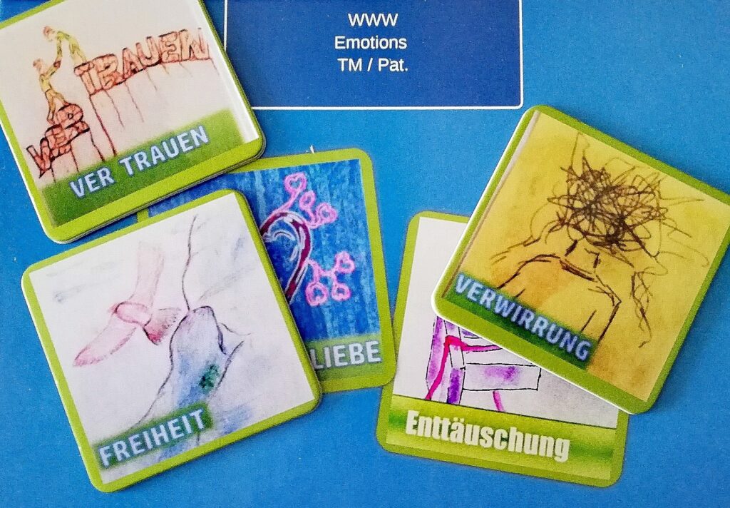 TripleW® besteht aus 43 gezeichneten Emotionsfeldern in Form von Karten. Dieselben 43 Emotionen gibt es auch auf Holzwürfeln mit Piktogrammen dargestellt. Auf den dazugehörenden Boards sind die Emotionen verschiebbar. Die Karten und Würfel haften mit kleinen Magneten auf den Boards. Sie lassen sich ohne grossen Aufwand einfach anordnen, verschieben, zueinander stellen, aufeinander stapeln und Vieles mehr… Damit sind Emotionen, innere und äussere Vorgänge und Konflikte 3Dimensional, dynamisch und in 1 zu 1 einfach und flexibel darstellbar.